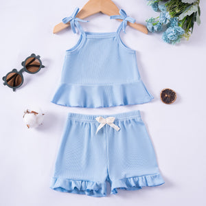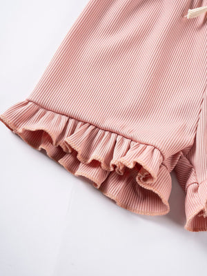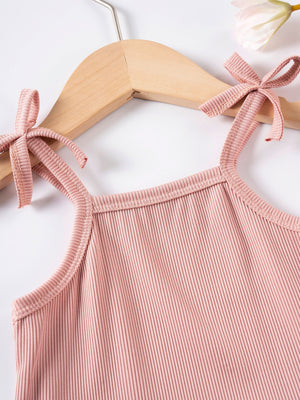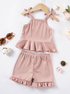 Romantico completo due pezzi per bambina, composto da top con spalline sottili annodate a fiocco e adorabile volant sul fondo, abbinato a shorts coordinati con volant sull’orlo e laccetto in vita. Realizzato in morbido tessuto a costine color rosa cipria, è ideale per le giornate estive grazie alla sua leggerezza e vestibilità confortevole. Un outfit perfetto per passeggiate, feste o semplicemente per sentirsi una piccola principessa ogni giorno.