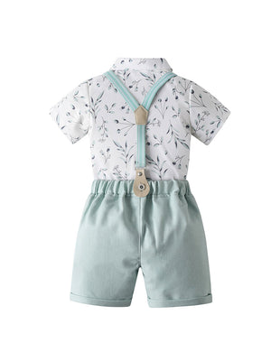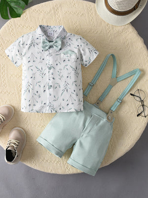 Fresco, raffinato e adorabile! Questo completo estivo da neonato è perfetto per le occasioni speciali. Composto da una camicia a maniche corte con stampa delicata a ramoscelli, shorts verde acqua con risvolto, bretelle regolabili e papillon coordinato.