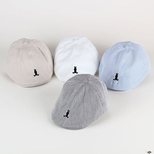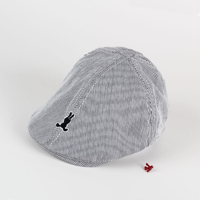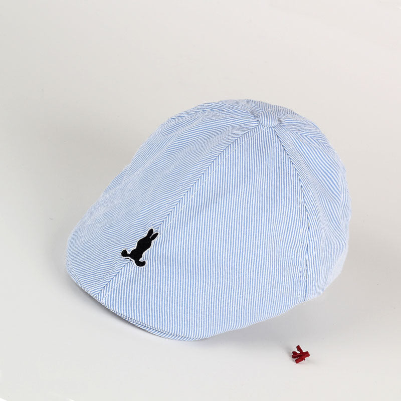 Stile fresco e divertente per i piccoli esploratori! Queste coppole in cotone leggero sono ideali per l’estate: proteggono dal sole con un tocco di eleganza. Ogni cappellino è decorato con un dolce ricamo coniglietto nero sul retro e disponibile in quattro varianti colore a righe: beige, bianco, celeste e grigio.