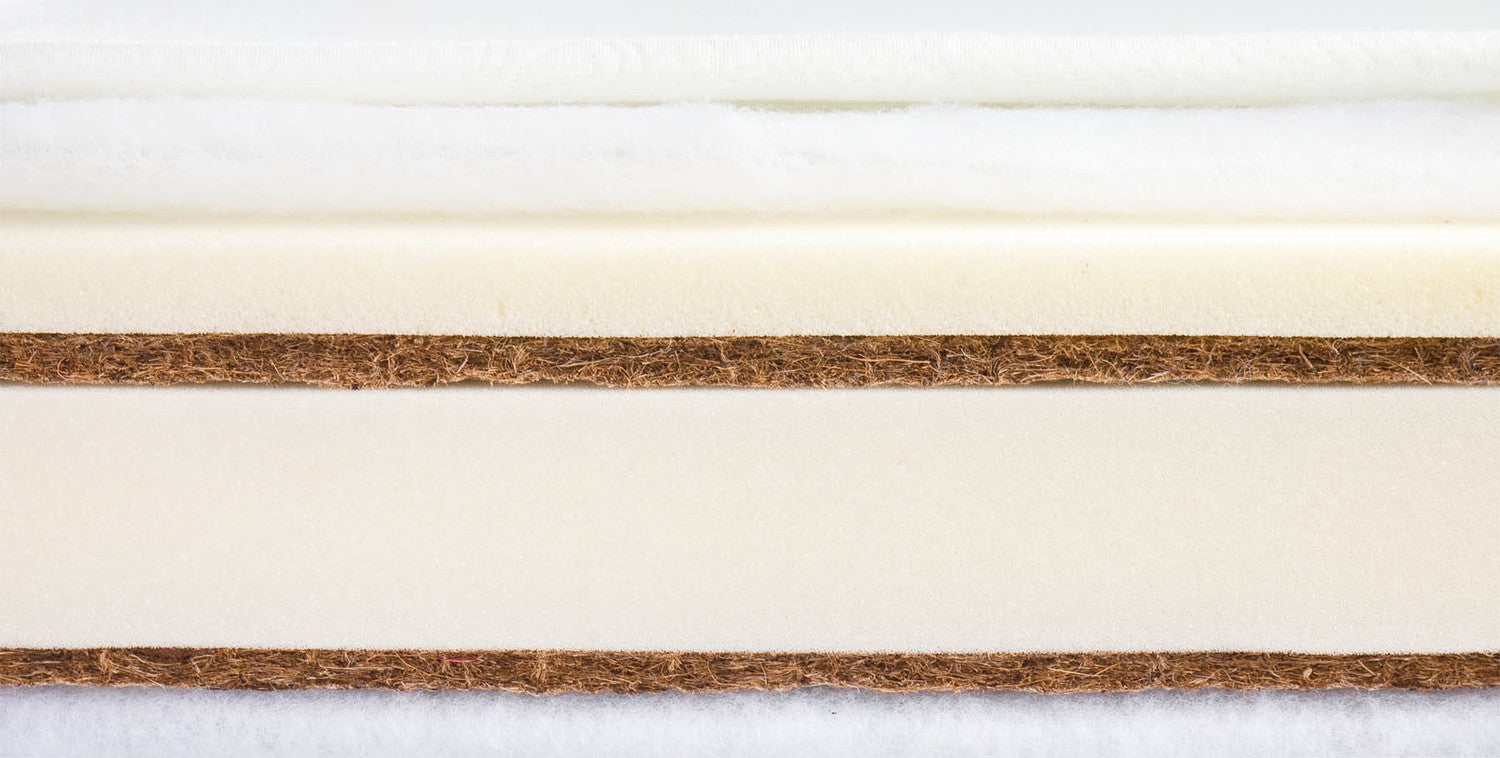 El relleno del colchón se compone de viscoelástica/termoelástica (2 cm), dos colchones de coco (2 x 1 cm) envueltos en suave tejido no tejido, separados con espuma de poliuretano (6 cm).
