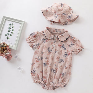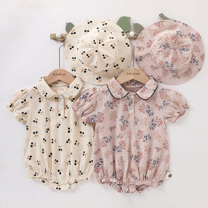 Un outfit perfetto per le giornate calde! Questo set per neonati include un romper leggero con stampa minimalista e un cappellino abbinato, ideale per proteggere la pelle delicata dal sole. Il design vintage con colletto classico e bottoncini frontali dona un tocco elegante, mentre il tessuto morbido e traspirante assicura massimo comfort.