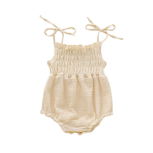 Fresco, leggero e delicato: questo body estivo è perfetto per le giornate più calde. Realizzato in tessuto di cotone a trama leggera, garantisce morbidezza e comfort sulla pelle delicata dei neonati. Il design arricciato dona un tocco dolce e romantico, mentre le bretelline regolabili con fiocchi aggiungono un dettaglio raffinato e pratico.