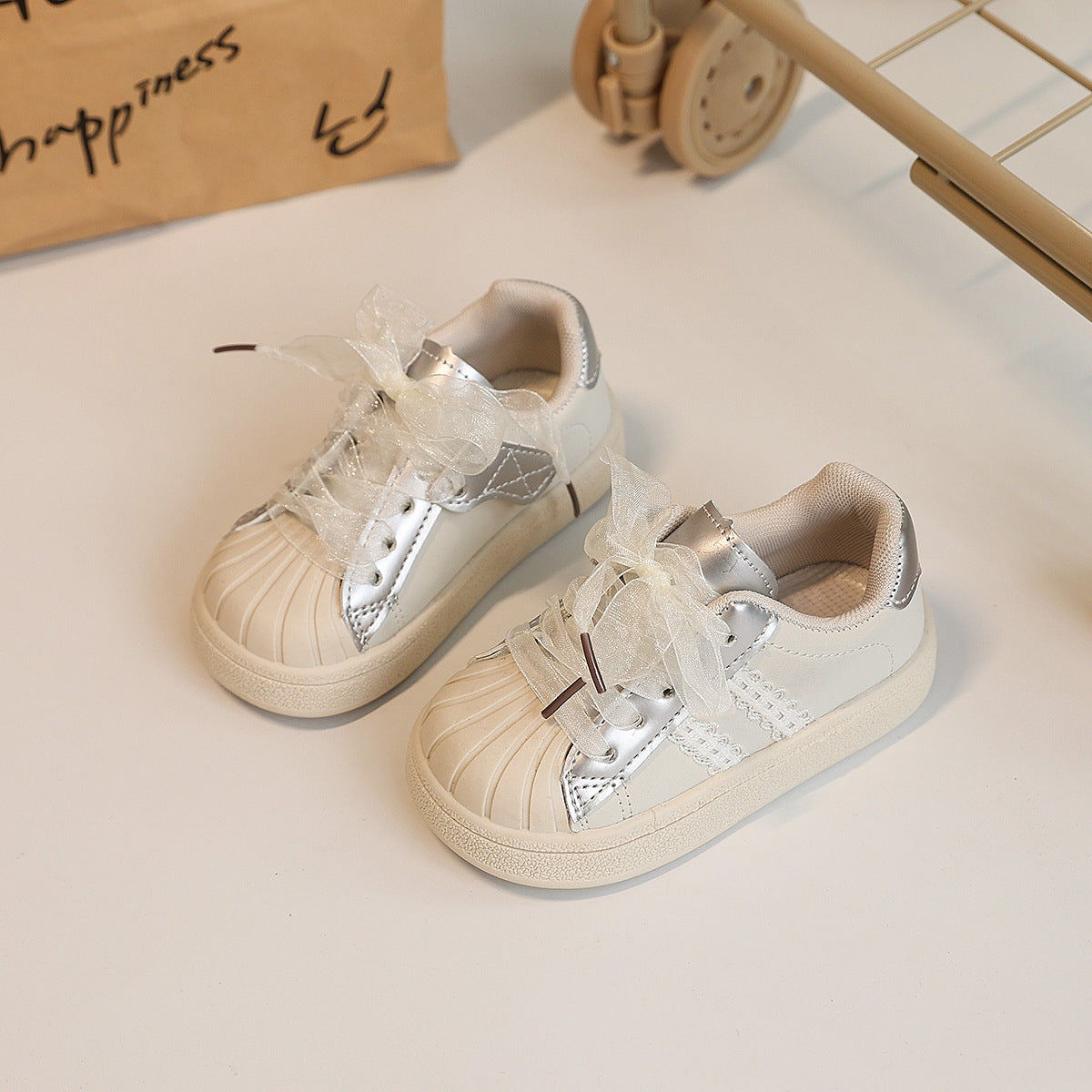 Dai un tocco glamour al look quotidiano con queste sneakers super trendy per bambina! Disponibili in tre varianti colore — nero/argento, bianco/argento e rosa cipria — sono caratterizzate da una punta rinforzata effetto conchiglia e da lacci in organza per uno stile delicato e raffinato. Realizzate con materiali resistenti e una suola antiscivolo, garantiscono comfort e sicurezza ad ogni passo. Perfette per la scuola, le uscite o gli outfit casual-chic. Un mix di comodità e stile che conquista!