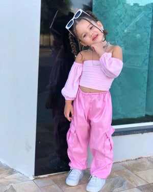 Look Trendy Rosa per Bambine con Top a Spalle Scoperte e Pantaloni Cargo