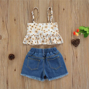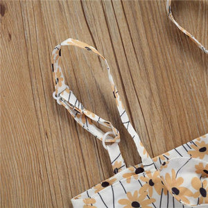 • Top floreale: un top smanicato con spalline sottili e motivo a fiori gialli su sfondo bianco. Ha un dettaglio annodato al centro e un orlo arricciato che aggiunge un tocco elegante.