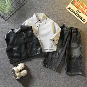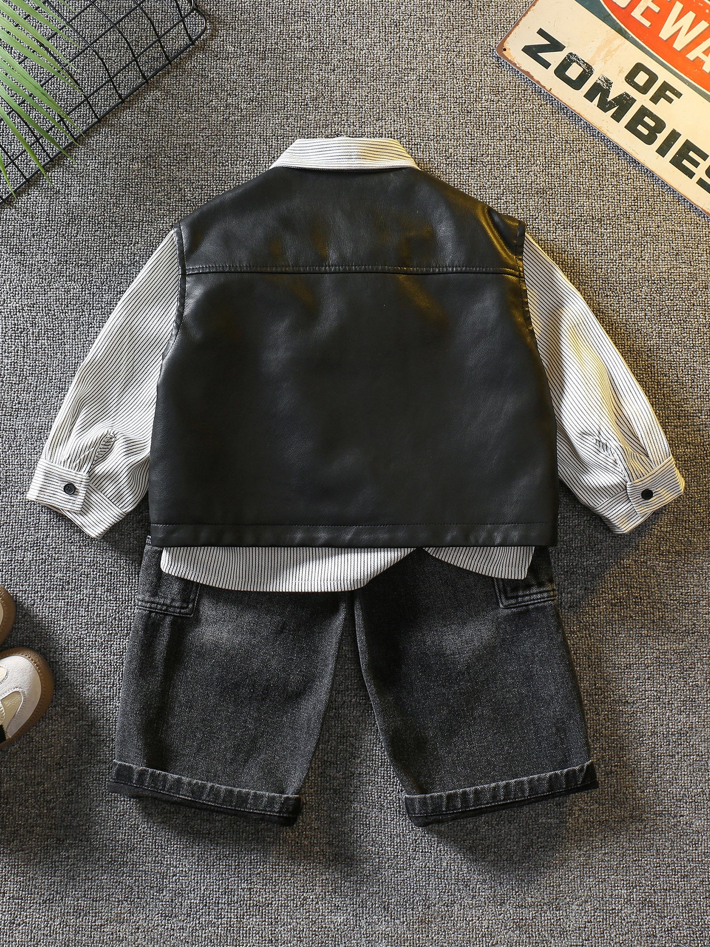 Set 3 pezzi bambino – Camicia a righe, gilet in ecopelle e jeans cargo neri