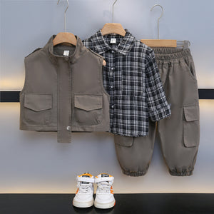Set 3 pezzi bambino con gilet, camicia a quadri e pantaloni cargo