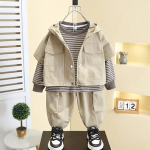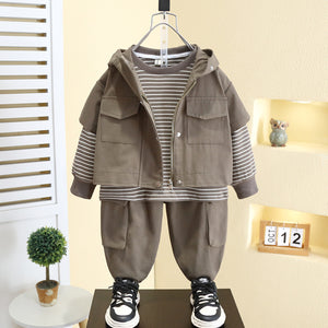 Set 3 Pezzi Bambino – Giacca con Cappuccio, Maglia a Righe e Pantaloni Cargo