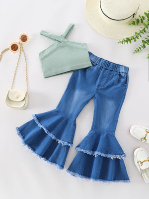 Home Set Bambina: Top Monospalla e Pantaloni a Zampa in Denim