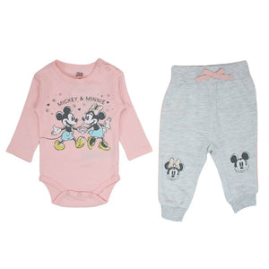 Tenero e confortevole completino per neonata con i personaggi iconici Disney, Topolino e Minnie! Il set include un body a maniche lunghe rosa con dolce stampa di Topolino e Minnie che si tengono per mano, realizzato in morbido cotone e dotato di pratici bottoncini per un cambio facile. I pantaloni grigi con elastico in vita e fiocchetto rosa assicurano il massimo comfort, impreziositi dalle simpatiche stampe di Topolino e Minnie sulle gambe. Perfetto per un look comodo e adorabile!