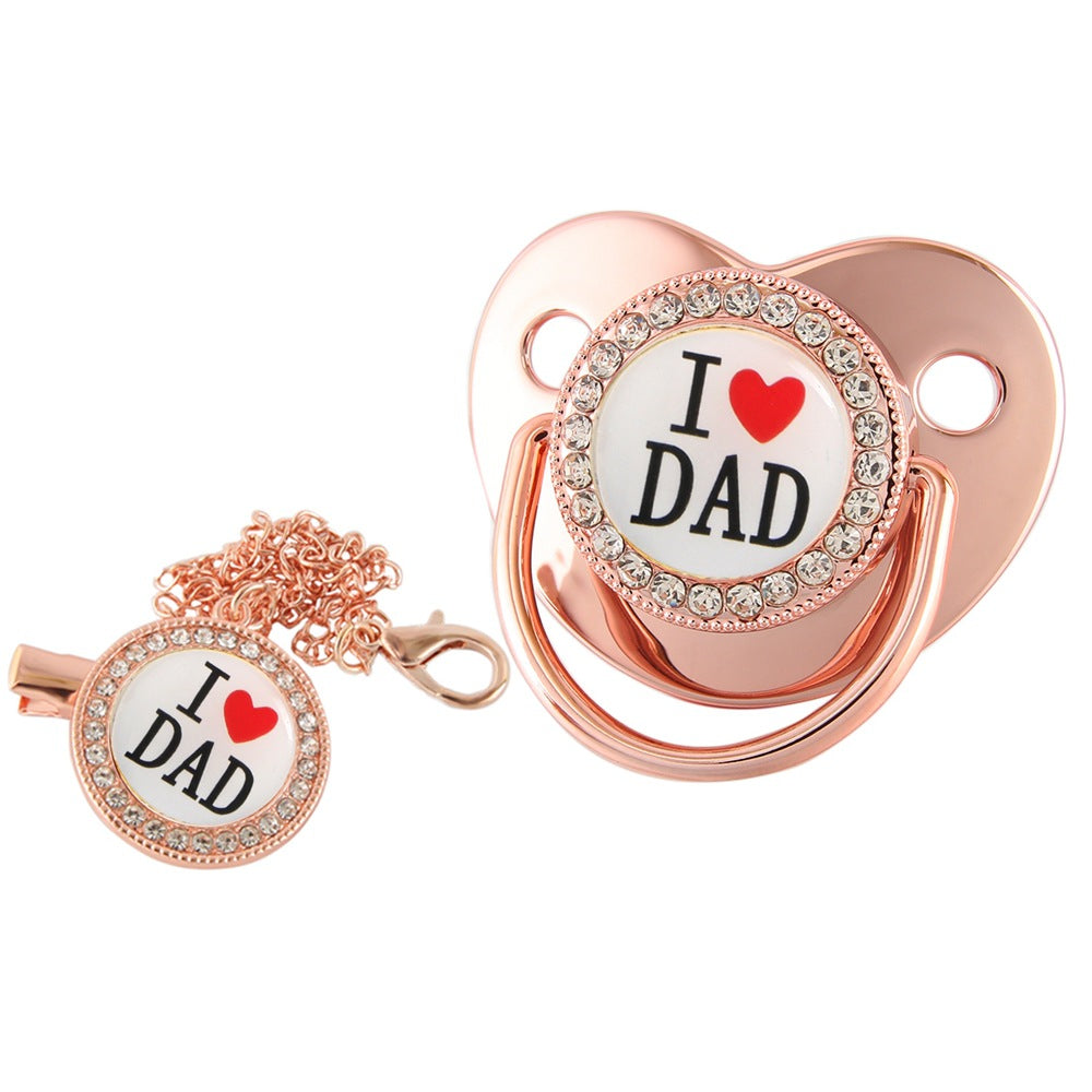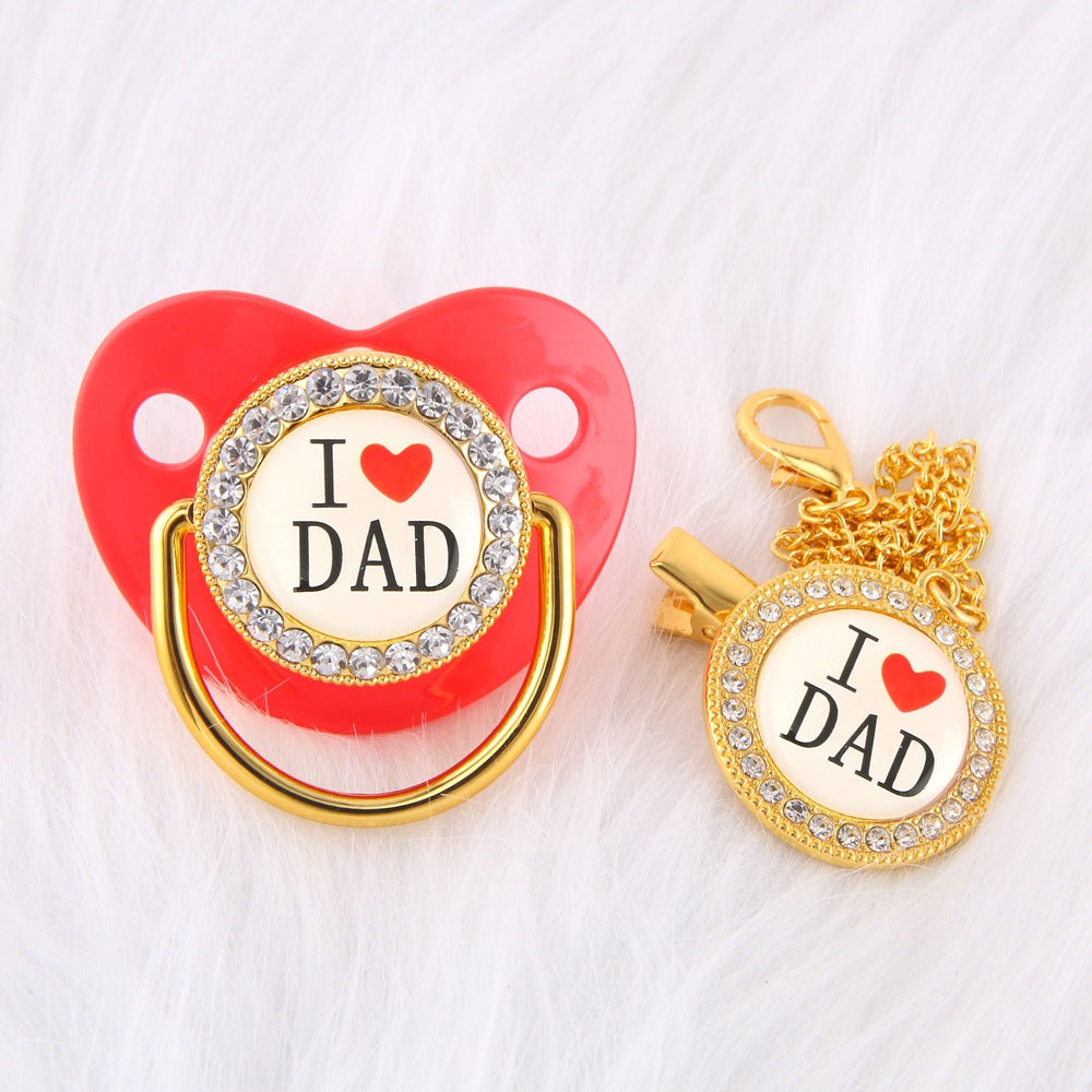 Un accessorio elegante e affettuoso che unisce praticità e stile. Realizzato con materiali sicuri per il bambino, questo ciuccio con catenella coordinata è impreziosito da dettagli brillanti e dalla dolce scritta "I ❤️ Dad", perfetta per esprimere tutto l’amore verso il papà.