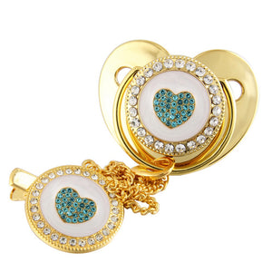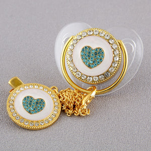 Un set elegante e raffinato composto da ciuccio con catenella coordinata, decorati con un cuore tempestato di cristalli turchesi su base bianca, incorniciato da luminosi strass. La placcatura oro dona un tocco di lusso e rende questo accessorio perfetto per cerimonie, servizi fotografici o come regalo speciale.
