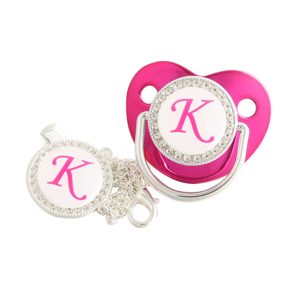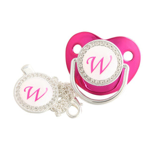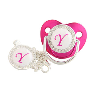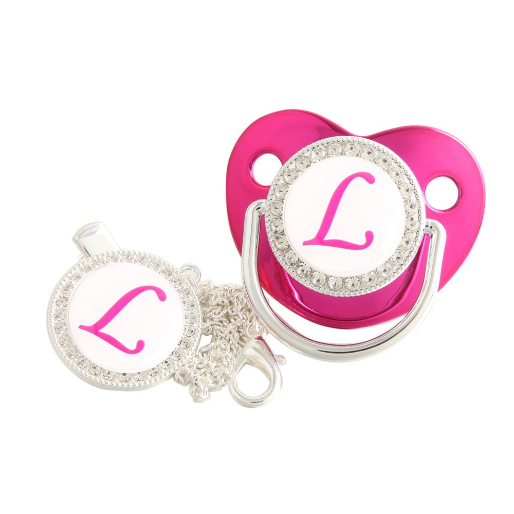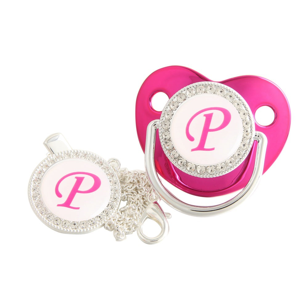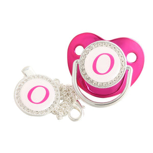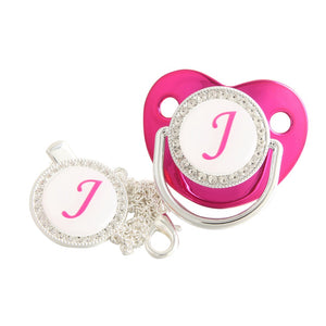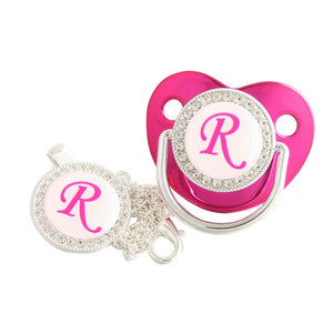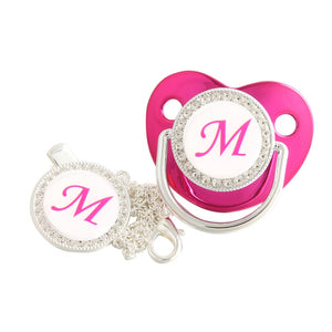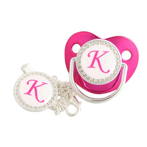 Raffinato set composto da ciuccio e catena con clip, decorati con cristalli luminosi e personalizzati con l’iniziale in elegante rosa.