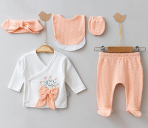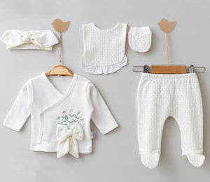Haz que cada día sea especial con este elegante conjunto de bebé niña, perfecto para tu princesita. Este adorable juego de 5 piezas incluye: