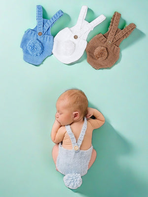 Regala al tuo piccolo un look dolcissimo con questo set fotografico in maglia ispirato ai coniglietti! Realizzato in morbido filato lavorato a mano, questo adorabile pagliaccetto con bretelle e simpatico pompon sul retro è perfetto per immortalare i primi momenti speciali del tuo bambino. Ideale per servizi fotografici newborn, baby shower o come regalo originale per una nascita.