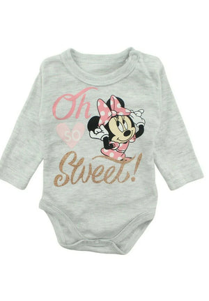 Adorabile set per neonata ispirato a Minnie, perfetto per un look dolce e confortevole! Il body a maniche lunghe in morbido cotone grigio presenta una simpatica stampa di Minnie con la scritta scintillante "Oh So Sweet", chiusura con bottoncini automatici per un cambio facile e veloce. I pantaloni abbinati, colore antracite, sono decorati con due dolci faccine di Minnie e un fiocchetto rosa in vita, con elastico per una vestibilità comoda. Un completino perfetto per il comfort e lo stile delle piccole fashioniste!