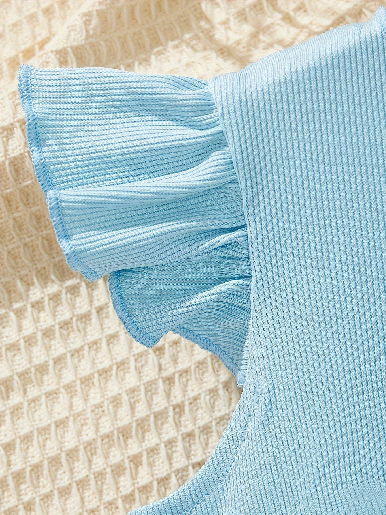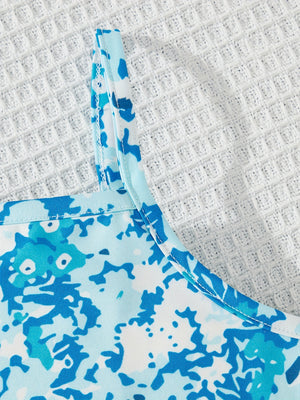 Set da 2 pezzi include un vestito leggero con spalline sottili e stampa floreale nei toni dell'azzurro, abbinato a un bolero corto con maniche a volant e maxi fiocco . Il tessuto fresco e traspirante lo rende ideale per le giornate calde, combinando comodità e stile.