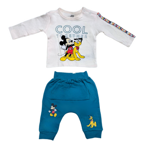 Questo adorabile completo Disney Baby è perfetto per un look comodo e alla moda! Il set include una maglia a maniche lunghe color crema con stampa di Topolino e Pluto e la scritta "Cool Together", ideale per un outfit allegro e dolce. I pantaloni in morbido cotone blu petrolio, con tasca frontale e simpatiche stampe di Topolino e Pluto, offrono una vestibilità confortevole per ogni movimento del tuo piccolo. Un completo pratico e stiloso per le giornate di gioco e relax