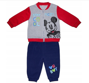 Tuta per neonato composta da felpa grigia con cerniera, maniche rosse e motivo di Topolino, e pantaloni blu navy abbinati. Interni lussuosi.