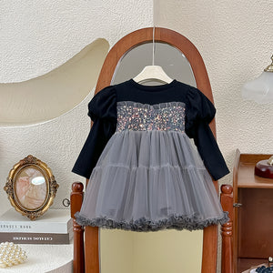 Un abito raffinato per le piccole regine delle occasioni speciali! Il corpetto in maglia nera a costine, con maniche lunghe a sbuffo, dona eleganza e comfort. Il top è impreziosito da un pannello ricamato con paillettes multicolor e un delicato volant in tulle. La gonna in tulle grigio a più strati crea un effetto vaporoso e romantico, ideale per cerimonie, compleanni e feste. Un vestito dal design sofisticato che unisce stile e dolcezza in un unico capo incantevole.