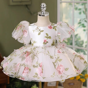 Raffinato abito da cerimonia per bambina, impreziosito da un delicato motivo floreale rosa e verde su fondo bianco. Il modello presenta maniche a palloncino in tulle trasparente decorato, che donano un tocco romantico e arioso. La gonna ampia e leggera crea un effetto principesco perfetto per eventi speciali. Il maxi fiocco coordinato sul retro, realizzato nello stesso tessuto del vestito, aggiunge una nota scenografica e incantevole. Ideale per battesimi, matrimoni o servizi fotografici. Un look da sogno per le piccole fashioniste.