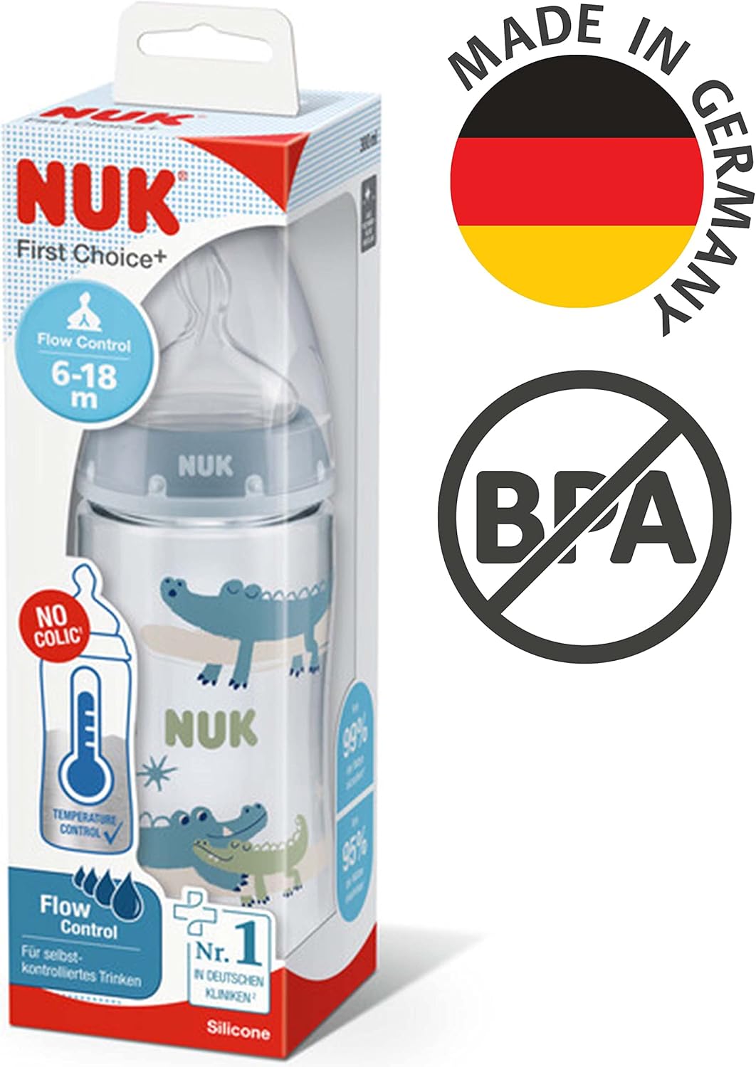 La bouteille First Choice+ avec indicateur de température intégré change de couleur en fonction de la température du contenu de la bouteille : si l'aliment est trop chaud, l'indicateur, généralement bleu, devient blanc. La jauge de température NUK est fournie à titre de vérification supplémentaire. Veuillez vérifier la température immédiatement avant de nourrir votre bébé. Le biberon est doté d'une tétine en silicone d'une douceur exceptionnelle et adaptée à la forme de la bouche. Biberon testé en milieu hospitalier pour une combinaison optimale d'allaitement et de biberon. Il dispose d'un système de ventilation anti-colique qui aide à prévenir les coliques. Pratique à remplir et à nettoyer, il possède une large ouverture de bouteille. Biberon d'une contenance de 300 ml, 6-18 m, avec une tétine en silicone qui contrôle le débit des aliments. Dimensions/poids : dimensions du produit (hauteur x largeur)[cm] : 19x6, dimensions de l'emballage (hauteur x largeur x profondeur)[cm] : 21x7x7, poids du produit sans emballage [kg] : 0,07 kg, poids du produit dans l'emballage [kg ] : 0,10 kg. Le produit est destiné aux enfants âgés de 6 à 18 mois et plus. Emballé dans une boîte avec fenêtre. Fabriqué en Allemagne.