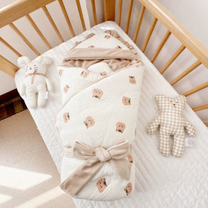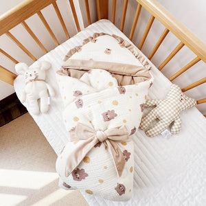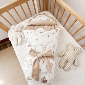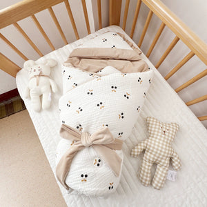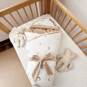 Morbida coperta/ baby sacco in mussola di cotone, ideale per avvolgere il tuo bebè in un abbraccio caldo e sicuro. Il design con fantasia arcobaleno su sfondo neutro e il fiocco decorativo la rendono perfetta per ogni occasione, dalla nanna alle coccole. L'interno è foderato con un tessuto ultra soffice per garantire il massimo comfort. Ideale per neonati, è un regalo perfetto per baby shower o nascite.