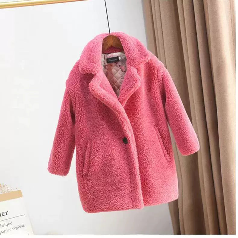 Morbido cappotto in pelliccia sintetica effetto teddy, perfetto per proteggere la tua bambina dal freddo con stile e comfort. Il design con colletto classico e tasche laterali lo rende pratico e versatile, ideale sia per l’uso quotidiano che per le occasioni speciali. Disponibile in più colori moda per adattarsi a ogni look invernale. Realizzato con tessuti caldi e resistenti, garantisce morbidezza e libertà di movimento.