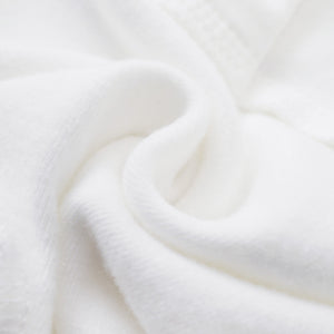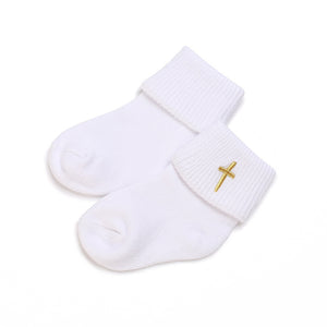 Elegante completo per battesimo da neonato composto da 5 pezzi: tutina bianca con croce dorata ricamata, cappellino coordinato, bavaglino, calzini e scarpine abbinate.