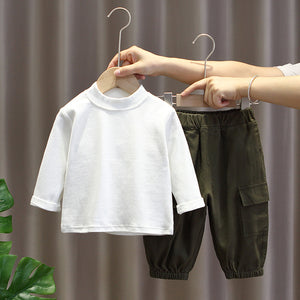 Set alla moda per bimbo composto da 3 pezzi: maglia bianca a maniche lunghe in cotone morbido, pantaloni verdi con tasche laterali cargo ed elastico in vita e gilet verde militare con zip e tasca frontale. Un outfit pratico e moderno, perfetto per la scuola, le uscite quotidiane o le giornate speciali. Tessuti comodi e resistenti, ideale per tutte le stagioni.