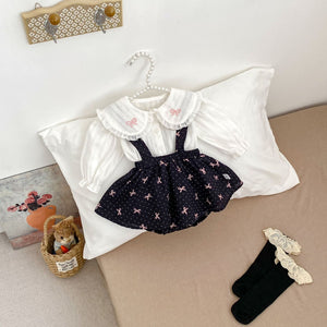 Un outfit raffinato e senza tempo per la tua piccola principessa! Questo completo è composto da una camicia bianca in cotone con un elegante colletto ricamato con fiocchetti rosa, maniche lunghe a sbuffo e chiusura con bottoncini. Abbinata a una graziosa gonna con bretelle, decorata con piccoli fiocchi rosa e pois, dona un look romantico e chic. Perfetto per occasioni speciali, servizi fotografici o un outfit da giorno raffinato!