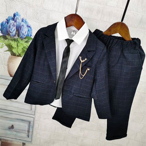 Un outfit raffinato e moderno per le occasioni speciali. Questo completo bambino a quadri nero include giacca elegante con spilla dorata, pantaloni con elastico in vita per il massimo comfort, camicia bianca con cravatta nera. Una scelta impeccabile per i piccoli gentleman.