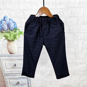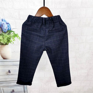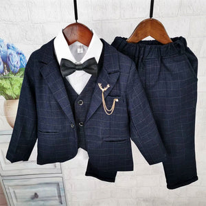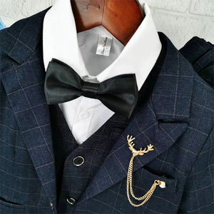 Elegante completo da bambino composto da giacca, gilet, camicia, papillon e  pantalone con motivo a quadri tono su tono, perfetto per cerimonie, battesimi, matrimoni o eventi speciali. Il look è completato da una camicia bianca classica e una cravatta nera. L'accessorio decorativo dorato a forma di corna di cervo con catenella dona un tocco raffinato e originale.