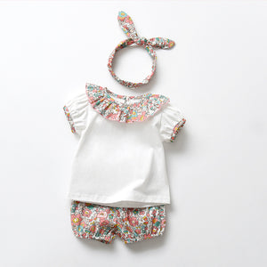 Un delizioso completo estivo per bambina composto da una maglietta bianca con dettagli floreali e pantaloncini coordinati in tessuto leggero e traspirante. Include un grazioso cerchietto abbinato per completare il look. Ideale per le giornate calde, garantisce comfort e stile per la tua piccola. Disponibile in diverse taglie per adattarsi perfettamente.
