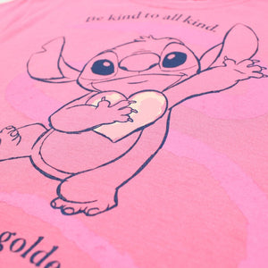 - Design dolce: T-shirt rosa con la scritta "Be kind to all kind. Kindness is golden." e un'illustrazione tenera di Stitch che tiene un cuore. I pantaloncini coordinati presentano una simpatica fantasia di Stitch.