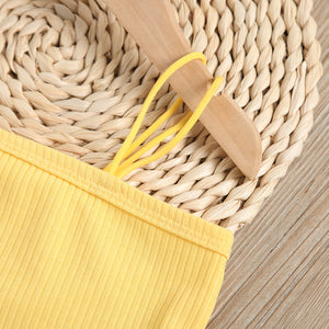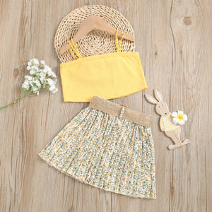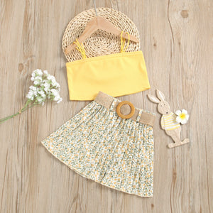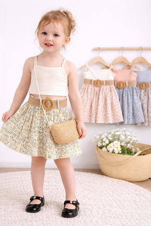 Delicato e versatile, questo completo estivo da bambina è composto da un top beige a costine con spalline sottili e da una gonna plissettata con fantasia floreale nei toni del giallo e verde. A completare il look, una raffinata cintura in tessuto intrecciato con fibbia effetto rafia. Leggero e confortevole, è l’outfit perfetto per giornate calde, passeggiate estive o eventi informali. Un mix elegante di semplicità e stile naturale.
