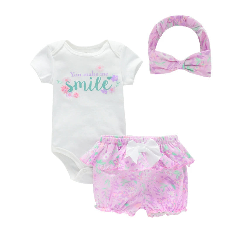 Delizioso set estivo per neonato composto da un body senza maniche con dolci volant sulle spalle , abbinato a calzoncini con balze in fantasia e una fascia coordinata con fiocco. Realizzato in cotone morbido e traspirante, è perfetto per le giornate calde, le passeggiate e le occasioni speciali. Un outfit fresco e allegro per la tua piccola principessa!