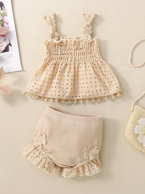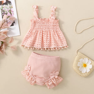 Un set estivo adorabile per le giornate piรน calde! Questo completo include un top smockato in tessuto traforato con bretelle decorate da delicati dettagli floreali e graziosi pompon sull'orlo. Abbinato a comodi bloomers con volant e applicazioni floreali, questo outfit รจ perfetto per un look fresco e alla moda. Realizzato in tessuti morbidi e traspiranti, รจ ideale per bambine dai 6 ai 24 mesi. Perfetto per passeggiate, servizi fotografici o momenti speciali. Eleganza naturale e comfort assicurati! ๐ฟโจ