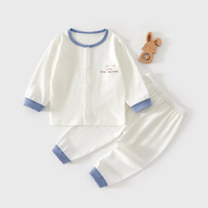 Dolcissimo completo due pezzi per neonato realizzato in morbido cotone 95% traspirante, perfetto per ogni stagione. Il set include maglia a maniche lunghe con bottoncini frontali e pantaloni coordinati con elastico in vita, decorati con dettagli colorati a contrasto sui polsini e la simpatica stampa Bear Brother.