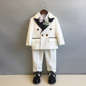 Il set include una giacca bianca doppiopetto con revers neri e dettagli a contrasto, pantaloni coordinati, camicia bianca e papillon nero . Un tocco di classe è dato dal fiore all’occhiello, per un look sofisticato e impeccabile. Perfetto per piccoli gentleman che vogliono distinguersi con stile.