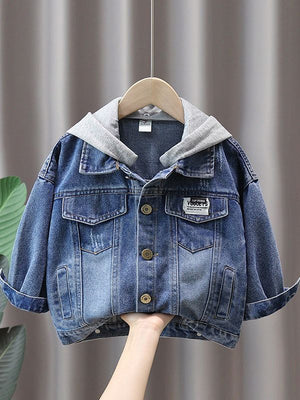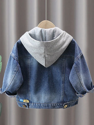 • Giacca in denim per bambino con cappuccio in cotone grigio integrato, ideale per un look casual e alla moda.