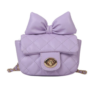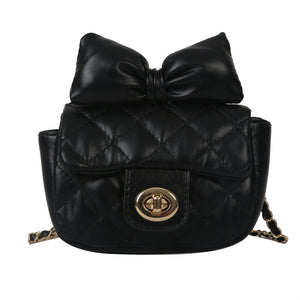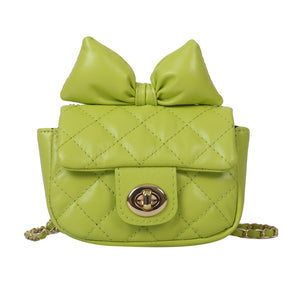 Eleganti mini borse in pelle sintetica trapuntata, decorate con un fiocco in tonalità vivaci e classiche. Disponibili in cinque colori: verde lime, nero, rosa, bianco e lilla. Ogni borsa è dotata di una catena dorata e chiusura a scatto, ideale per aggiungere un tocco chic a qualsiasi outfit.