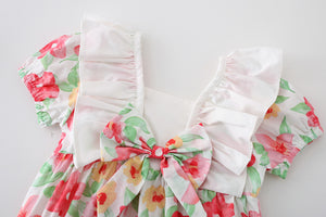 Questo adorabile pagliaccetto estivo è perfetto per le giornate calde! Realizzato in cotone leggero e traspirante, presenta un'elegante stampa floreale dai colori vivaci e dettagli romantici come:
