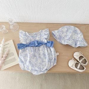 Un outfit elegante e raffinato per le giornate più calde! Questo adorabile set include un pagliaccetto in cotone con stampa floreale azzurra, spalline con volant e un dolce fiocco in vita che dona un tocco romantico. Il cappello coordinato protegge dal sole, mentre il design leggero assicura massimo comfort alla tua piccola. Perfetto per cerimonie, servizi fotografici o semplicemente per un look chic quotidiano!