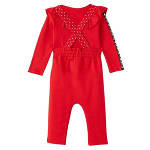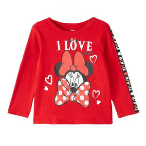 Deliziosa Salopette rossa per bambina ispirata a Minnie Mouse, perfetta per un look comodo e alla moda. Il design presenta una stampa centrale di Minnie con la scritta "I LOVE" e dettagli unici come le rouches sulle spalle e le bretelle a pois che aggiungono un tocco di dolcezza. Realizzata in morbido cotone elasticizzato, garantisce comfort e libertà di movimento. Il pantalone a vita alta con elastico offre una vestibilità comoda, mentre il dettaglio sulla manica con scritta "Minnie" dona un tocco trendy. Ideale per le giornate più fresche e per ogni piccola fan Disney!