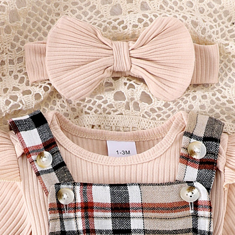 Rendi irresistibile il look della tua bambina con questo elegante set composto da una salopette a quadri, una maglia beige con maniche a volant e una dolcissima fascia con fiocco! 🎀 Perfetto per occasioni speciali o per un look quotidiano chic e comodo.