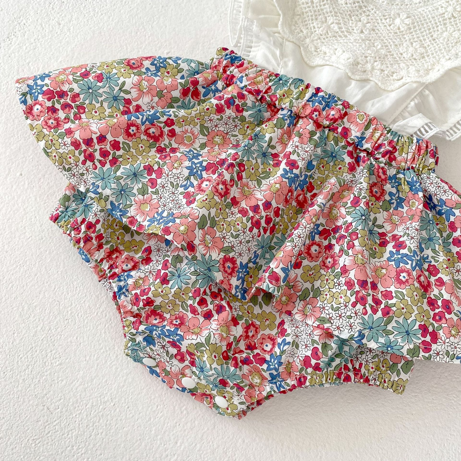 - Top Ricamato: Realizzato in morbido cotone bianco, con dettagli in pizzo e volant per un tocco romantico.