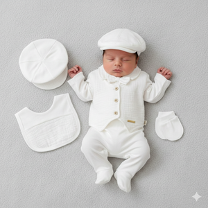 ✔ Set completo 5 pezzi : body con colletto, gilet con bottoni in legno, pantaloni con piedini, bavaglino coordinato e cappellino stile Gatsby.
