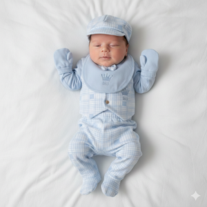 ✔ Set completo 5 pezzi : body con colletto, gilet con bottoni in legno, pantaloni con piedini, bavaglino coordinato e cappellino stile Gatsby.