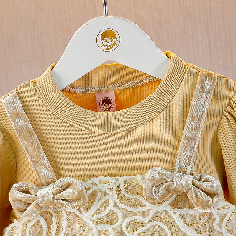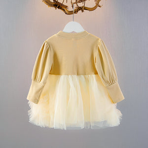 Un vestitino da sogno per le piccole principesse! Questo splendido abito combina un morbido top a maniche lunghe in cotone a costine color beige con una raffinata salopette decorata con ricami in velluto e fiocchetti delicati. La gonna in tulle vaporoso aggiunge un tocco di magia, rendendolo perfetto per occasioni speciali, feste o servizi fotografici. Comodo e stiloso, è l'outfit ideale per far sentire la tua bambina come una vera protagonista!